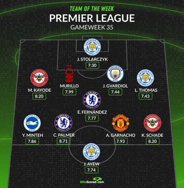 直播吧5月6日讯 英超第35轮战罢,数据网站Whoscored也盘点了本轮比赛评分最高阵容,其中加纳乔、恩佐等在列,具体如下:门将:斯托拉奇克(莱斯特城)后卫:卡约德(布伦特福德)、穆里略(诺丁汉森林)、格瓦迪奥尔(曼城)、L-托...